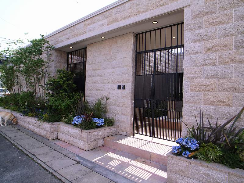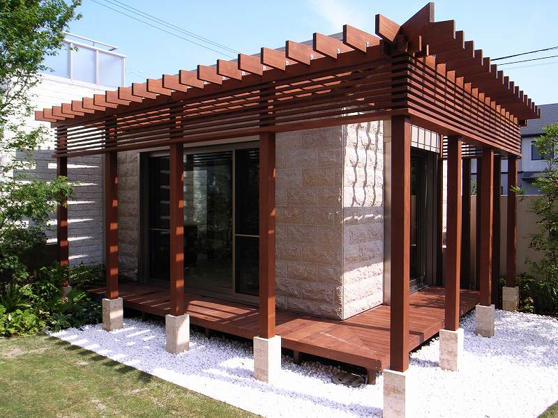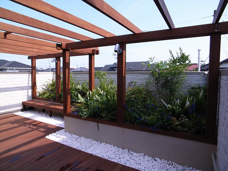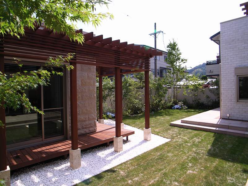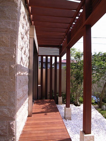 オリジナルプランター、アプローチ石貼り、ウッドパーゴラ、ウッドデッキ、アイアン手摺、植栽(ヤマモミジ他)