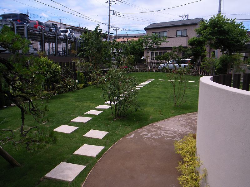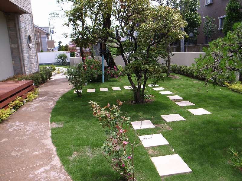 ウッドデッキ、エントランスゲート、アプローチ石貼り、水鉢、植栽(ハナミズキ他)