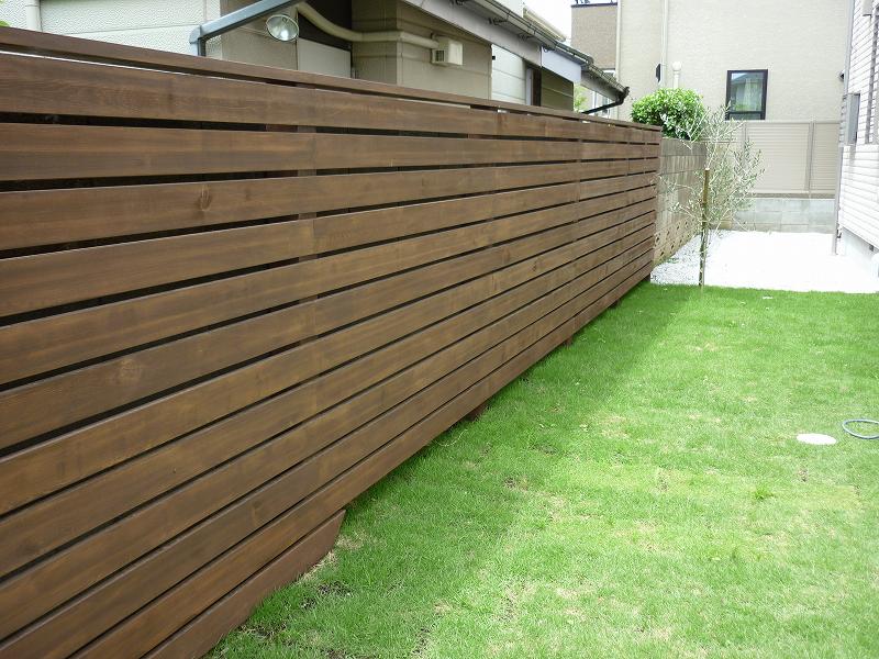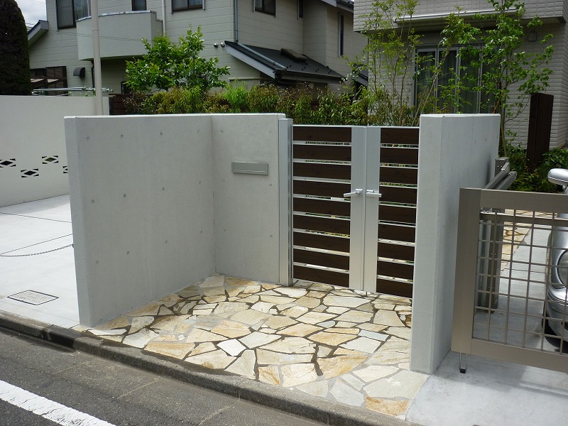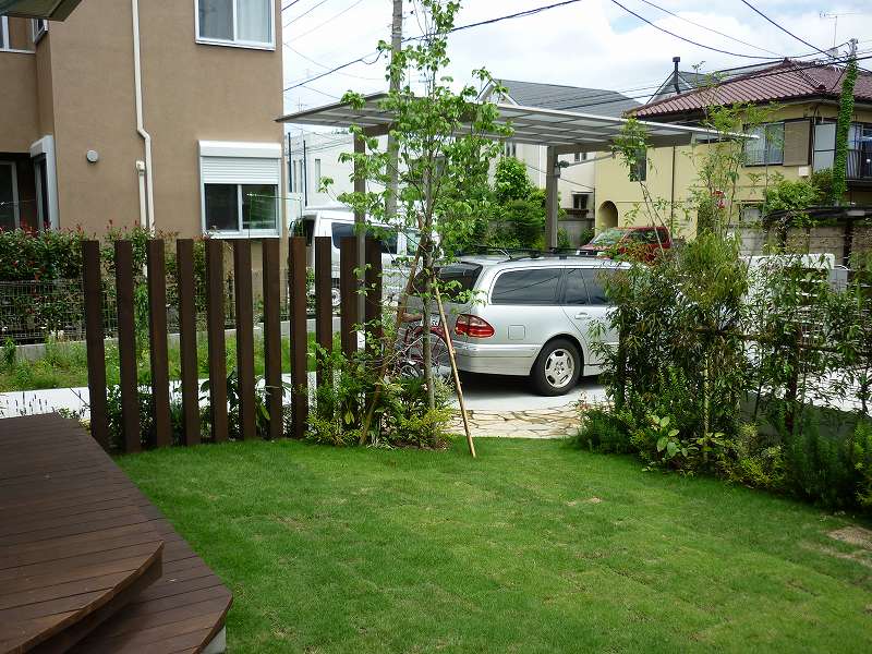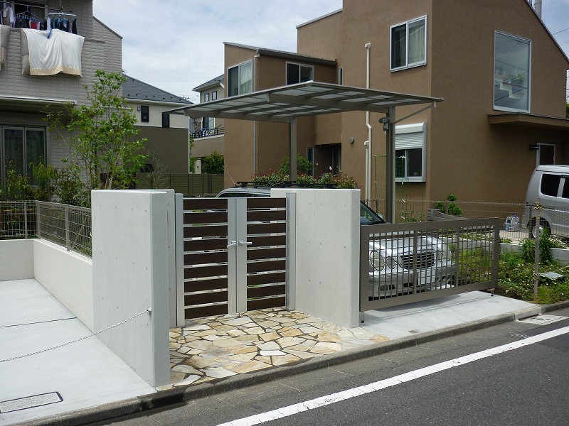 門塀、門扉、カーポート、アプローチ床上げ、ウッドデッキ、フェンス、列柱、植栽(シマトネリコ他)