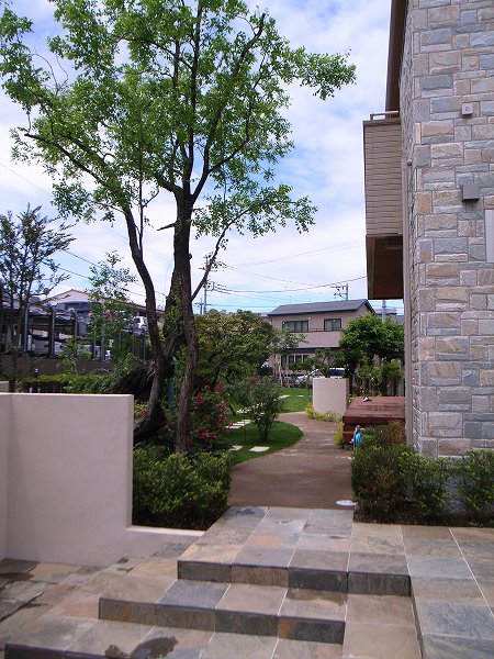 ウッドデッキ、エントランスゲート、アプローチ石貼り、水鉢、植栽(ハナミズキ他)